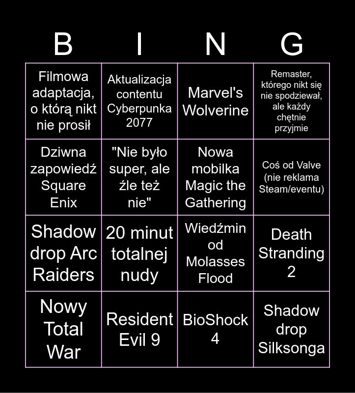 This bingo card has 16 words: Resident Evil 9, Death Stranding 2, Marvel's Wolverine, Filmowa adaptacja, o którą nikt nie prosił, Shadow drop Arc Raiders, Aktualizacja contentu Cyberpunka 2077, Wiedźmin od Molasses Flood, BioShock 4, Dziwna zapowiedź Square Enix, "Nie było super, ale źle też nie", Nowy Total War, Remaster, którego nikt się nie spodziewał, ale każdy chętnie przyjmie, 20 minut totalnej nudy, Coś od Valve (nie reklama Steam/eventu), Nowa mobilka Magic the Gathering and Shadow drop Silksonga.