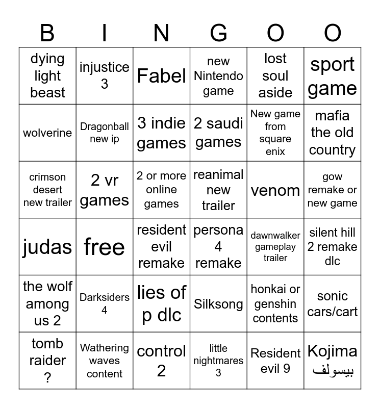 This bingo card has 36 words: Silksong, lies of p dlc, little nightmares 3, wolverine, judas, reanimal new trailer, Dragonball new ip, control 2, lost soul aside, honkai or genshin contents, mafia the old country, new Nintendo game, sonic cars/cart, 2 vr games, 2 saudi games, dying light beast, the wolf among us 2, venom, crimson desert new trailer, Fabel, 2 or more online games, free, persona 4 remake, resident evil remake, dawnwalker gameplay trailer, injustice 3, New game from square enix, Wathering waves content, 3 indie games, sport game, Kojima بيسولف, tomb raider ?, silent hill 2 remake dlc, gow remake or new game, Darksiders 4 and Resident evil 9.