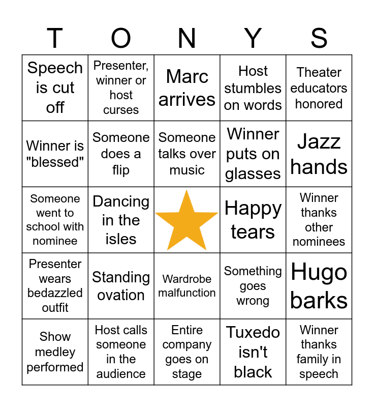 This bingo card has a free space and 26 words: Wardrobe malfunction, Tuxedo isn't black, Someone talks over music, Host calls someone in the audience, Theater educators honored, Speech is cut off, Winner is "blessed", Presenter, winner or host curses, Winner thanks other nominees, Something goes wrong, Winner puts on glasses, Someone went to school with nominee, Hugo barks, Show medley performed, Dancing in the isles, Quick costume change, Host stumbles on words, Presenter wears bedazzled outfit, Marc arrives, Winner thanks family in speech, Jazz hands, Entire company goes on stage, Happy tears, Standing ovation, Someone does a flip and A winner says "amazing" more than once.