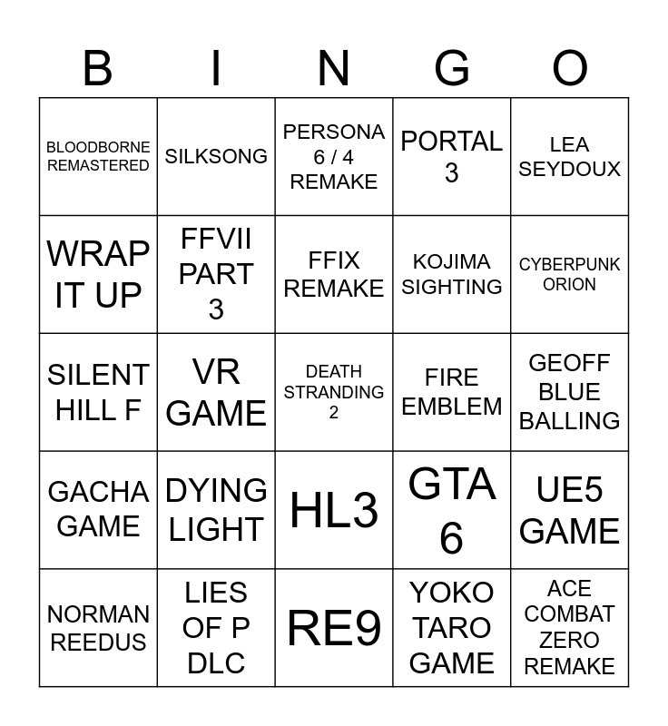 This bingo card has a free space and 24 words: DYING LIGHT, LIES OF P DLC, FFIX REMAKE, NORMAN REEDUS, LEA SEYDOUX, BLOODBORNE REMASTERED, WRAP IT UP, SILKSONG, FIRE EMBLEM, HL3, KOJIMA SIGHTING, SILENT HILL F, GTA 6, UE5 GAME, FFVII PART 3, YOKO TARO GAME, GEOFF BLUE BALLING, PERSONA 6 / 4 REMAKE, CYBERPUNK ORION, VR GAME, ACE COMBAT ZERO REMAKE, GACHA GAME, PORTAL 3 and RE9.