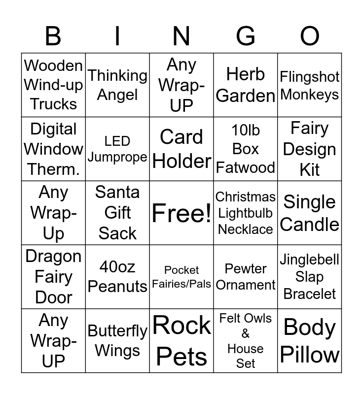 This bingo card has a free space and 24 words: 40oz Peanuts, Butterfly Wings, Card Holder, Any Wrap-UP, Flingshot Monkeys, Wooden Wind-up Trucks, Digital Window Therm., Thinking Angel, Christmas Lightbulb Necklace, Pocket Fairies/Pals, 10lb Box Fatwood, Any Wrap-Up, Pewter Ornament, Jinglebell Slap Bracelet, LED Jumprope, Felt Owls & House Set, Single Candle, Any Wrap-UP, Fairy Design Kit, Santa Gift Sack, Body Pillow, Dragon Fairy Door, Herb Garden and Rock Pets.