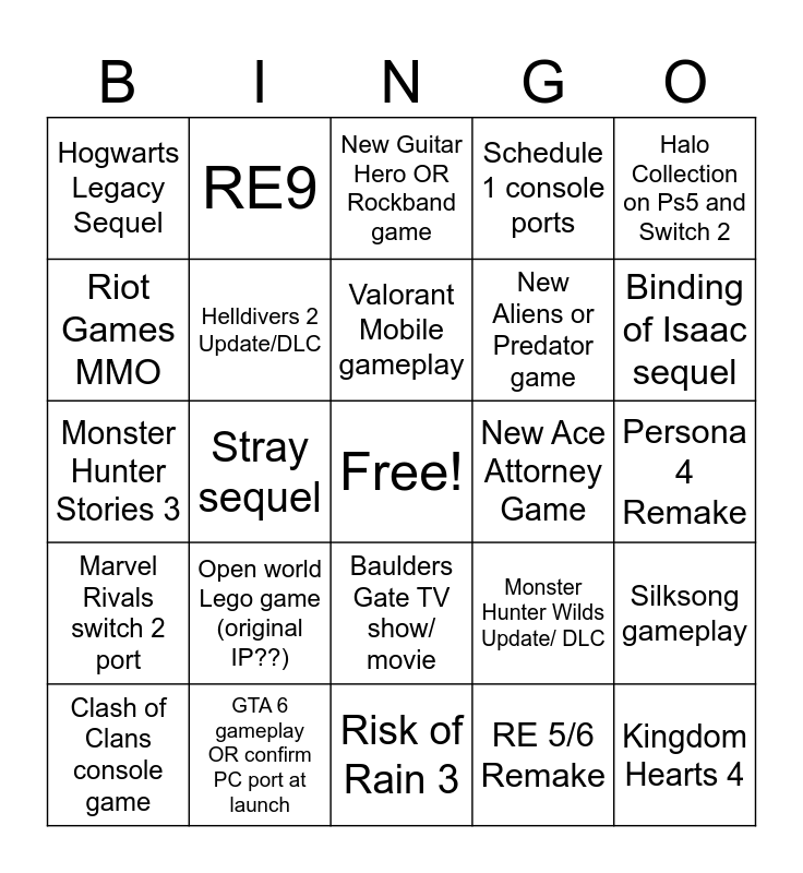 This bingo card has a free space and 24 words: Open world Lego game (original IP??), GTA 6 gameplay OR confirm PC port at launch, Valorant Mobile gameplay, Clash of Clans console game, Halo Collection on Ps5 and Switch 2, Hogwarts Legacy Sequel, Riot Games MMO, RE9, New Ace Attorney Game, Baulders Gate TV show/ movie, New Aliens or Predator game, Monster Hunter Stories 3, Monster Hunter Wilds Update/ DLC, Silksong gameplay, Helldivers 2 Update/DLC, RE 5/6 Remake, Persona 4 Remake, New Guitar Hero OR Rockband game, Binding of Isaac sequel, Stray sequel, Kingdom Hearts 4, Marvel Rivals switch 2 port, Schedule 1 console ports and Risk of Rain 3.