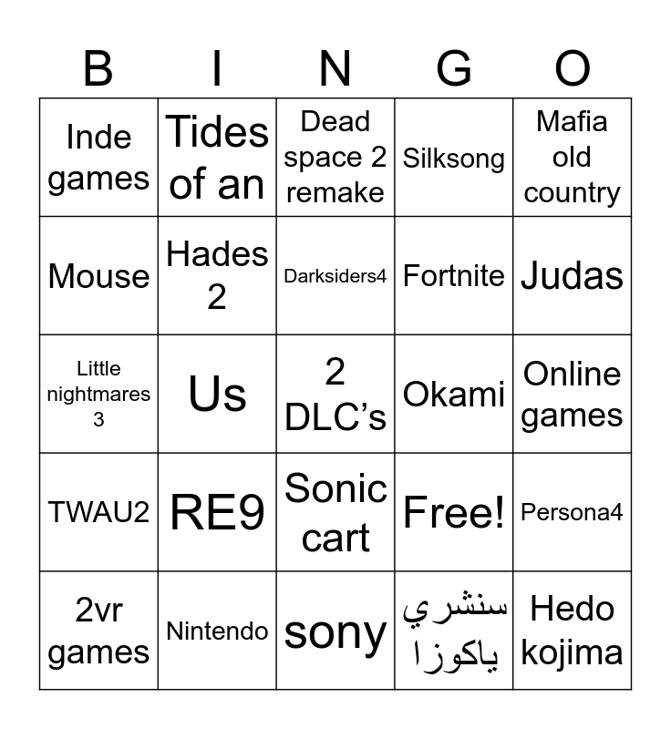This bingo card has 25 words: RE9, sony, Darksiders4, 2vr games, Mafia old country, Inde games, Mouse, Tides of an, Okami, Sonic cart, Fortnite, Little nightmares 3, Free!, Persona4, Hades 2, Hedo kojima, Online games, Dead space 2 remake, Judas, Us, 2 DLC’s, Nintendo, TWAU2, Silksong and سنشري ياكوزا.