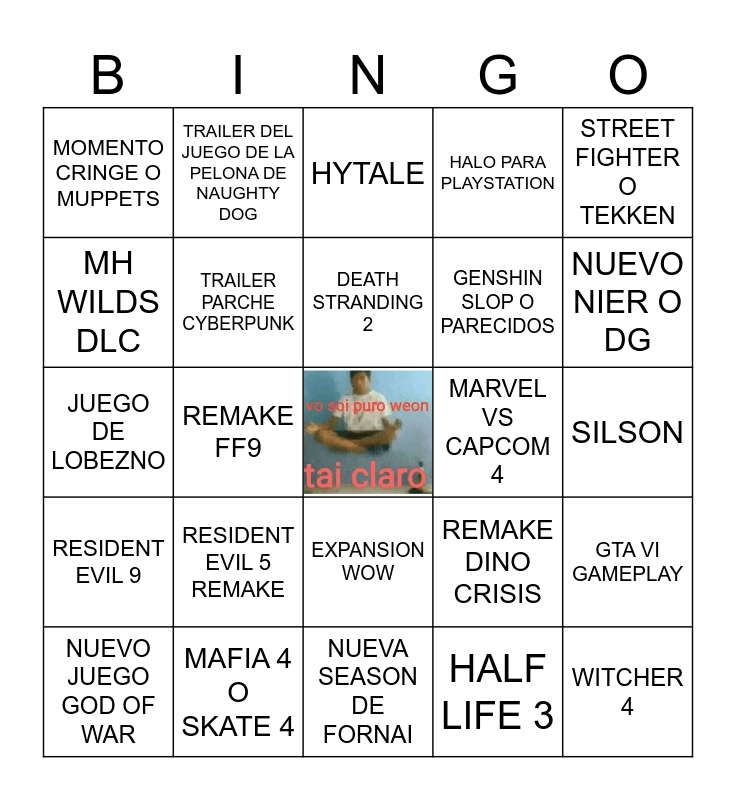 This bingo card has a free space and 24 words: RESIDENT EVIL 5 REMAKE, MAFIA 4 O SKATE 4, DEATH STRANDING 2, NUEVO JUEGO GOD OF WAR, STREET FIGHTER O TEKKEN, MOMENTO CRINGE O MUPPETS, MH WILDS DLC, TRAILER DEL JUEGO DE LA PELONA DE NAUGHTY DOG, MARVEL VS CAPCOM 4, EXPANSION WOW, GENSHIN SLOP O PARECIDOS, JUEGO DE LOBEZNO, REMAKE DINO CRISIS, GTA VI GAMEPLAY, TRAILER PARCHE CYBERPUNK, HALF LIFE 3, SILSON, HYTALE, NUEVO NIER O DG, REMAKE FF9, WITCHER 4, RESIDENT EVIL 9, HALO PARA PLAYSTATION and NUEVA SEASON DE FORNAI.