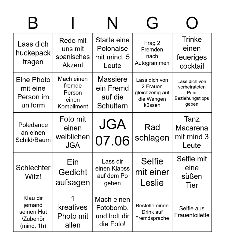 This bingo card has a free space and 24 words: Ein Gedicht aufsagen, 1 kreatives Photo mit allen, Massiere ein Fremd auf die Schultern, Klau dir jemand seinen Hut /Zubehör (mind. 1h), Trinke einen feueriges cocktail, Lass dich huckepack tragen, Eine Photo mit eine Person im uniform, Rede mit uns mit spanisches Akzent, Rad schlagen, Lass dir einen Klapss auf dem Po geben, Lass dich von 2 Frauen gleichzeitig auf die Wangen küssen, Poledance an einen Schild/Baum, Selfie mit einer Leslie, Selfie mit eine süßen Tier, Mach einen fremde Person einen Kompliment, Bestelle einen Drink auf Fremdsprache, Tanz Macarena mit mind 3 Leute, Starte eine Polonaise mit mind. 5 Leute, Lass dich von verheirateten Paar Beziehungstipps geben, Foto mit einen weiblichen JGA, Selfie aus Frauentoilette, Schlechter Witz!, Frag 2 Fremden nach Autogrammen and Mach einen Fotobomb, und holt dir die Foto!.
