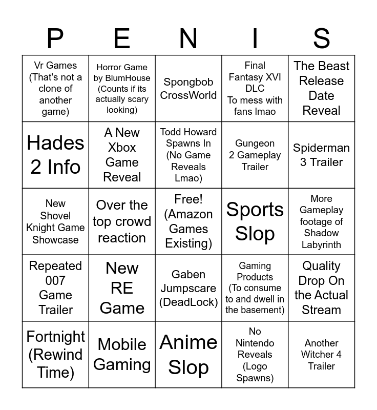 This bingo card has a free space and 24 words: New RE Game, Mobile Gaming, Todd Howard Spawns In (No Game Reveals Lmao), Fortnight (Rewind Time), The Beast Release Date Reveal, Vr Games (That's not a clone of another game), Hades 2 Info, Horror Game by BlumHouse (Counts if its actually scary looking), Sports Slop, Gaben Jumpscare (DeadLock), Gungeon 2 Gameplay Trailer, New Shovel Knight Game Showcase, Gaming Products (To consume to and dwell in the basement), Quality Drop On the Actual Stream, A New Xbox Game Reveal, No Nintendo Reveals (Logo Spawns), More Gameplay footage of Shadow Labyrinth, Spongbob CrossWorld, Spiderman 3 Trailer, Over the top crowd reaction, Another Witcher 4 Trailer, Repeated 007 Game Trailer, Final Fantasy XVI DLC To mess with fans lmao and Anime Slop.