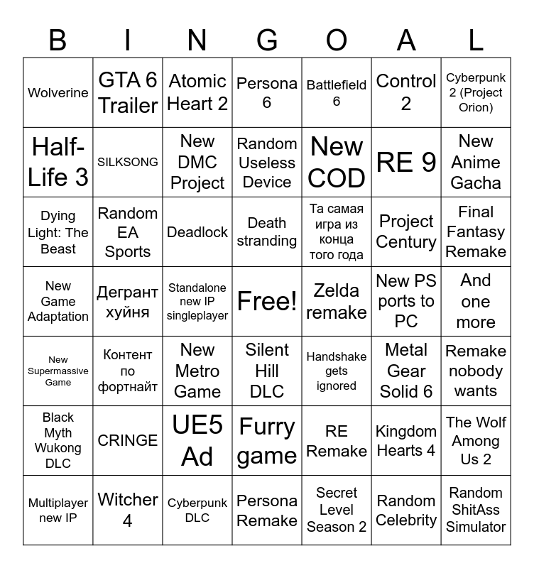 This bingo card has a free space and 48 words: RE Remake, RE 9, Persona Remake, Дегрант хуйня, Deadlock, And one more, GTA 6 Trailer, Witcher 4, Control 2, Silent Hill DLC, Cyberpunk 2 (Project Orion), Persona 6, Project Century, Та самая игра из конца того года, Black Myth Wukong DLC, New PS ports to PC, Half-Life 3, New Anime Gacha, Kingdom Hearts 4, Battlefield 6, New COD, Standalone new IP singleplayer, Wolverine, SILKSONG, The Wolf Among Us 2, New DMC Project, Final Fantasy Remake, Multiplayer new IP, Death stranding, Random EA Sports, Random Celebrity, Zelda remake, Remake nobody wants, CRINGE, New Game Adaptation, Handshake gets ignored, Metal Gear Solid 6, Dying Light: The Beast, New Metro Game, UE5 Ad, New Supermassive Game, Random ShitAss Simulator, Atomic Heart 2, Cyberpunk DLC, Random Useless Device, Furry game, Контент по фортнайт and Secret Level Season 2.