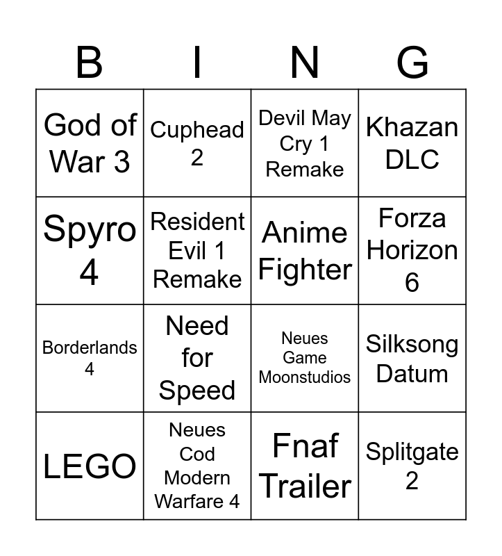 This bingo card has 16 words: Neues Cod Modern Warfare 4, Silksong Datum, Devil May Cry 1 Remake, God of War 3, Borderlands 4, Cuphead 2, Neues Game Moonstudios, Fnaf Trailer, Spyro 4, Resident Evil 1 Remake, LEGO, Khazan DLC, Need for Speed, Forza Horizon 6, Anime Fighter and Splitgate 2.