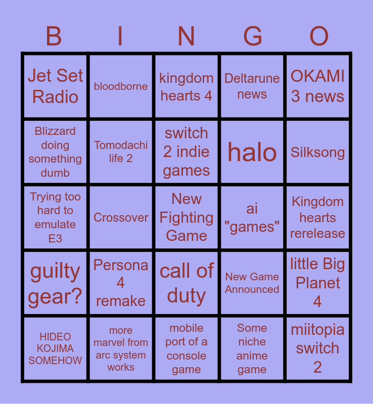 This bingo card has 25 words: Persona 4 remake, mobile port of a console game, switch 2 indie games, HIDEO KOJIMA SOMEHOW, OKAMI 3 news, Jet Set Radio, Blizzard doing something dumb, bloodborne, ai "games", call of duty, halo, Trying too hard to emulate E3, New Game Announced, little Big Planet 4, Tomodachi life 2, miitopia switch 2, Kingdom hearts rerelease, kingdom hearts 4, Silksong, Crossover, New Fighting Game, more marvel from arc system works, guilty gear?, Deltarune news and Some niche anime game.