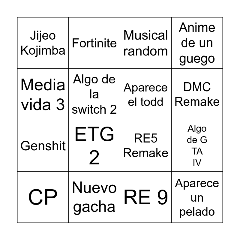 This bingo card has 16 words: Nuevo gacha, Algo de GTA IV, Musical random, Jijeo Kojimba, Genshit, Fortinite, RE5 Remake, RE 9, Media vida 3, Algo de la switch 2, CP, Anime de un guego, ETG 2, DMC Remake, Aparece el todd and Aparece un pelado.