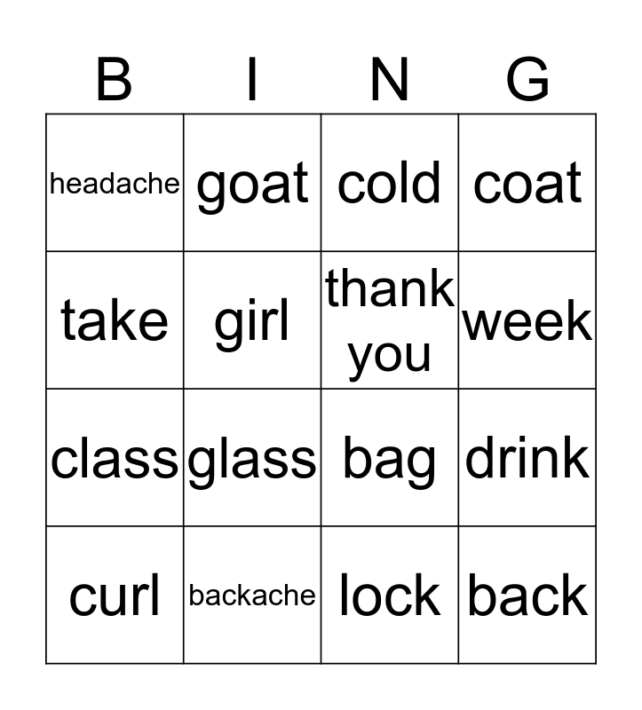 This bingo card has a free space and 15 words: curl, back, cold, headache, week, take, glass, lock, girl, class, drink, coat, thank you, goat and backache.