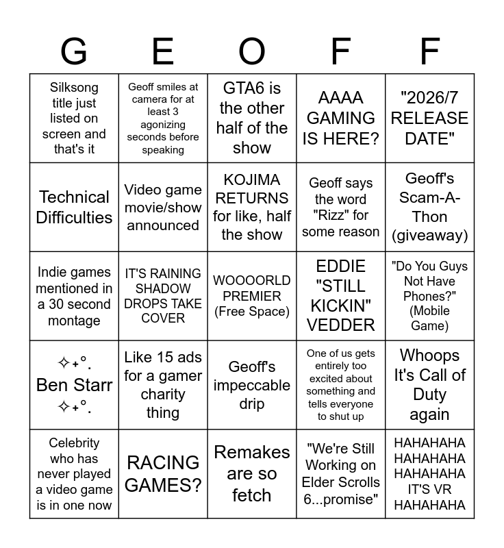 This bingo card has a free space and 24 words: Like 15 ads for a gamer charity thing, RACING GAMES?, KOJIMA RETURNS for like, half the show, Celebrity who has never played a video game is in one now, "2026/7 RELEASE DATE", Silksong title just listed on screen and that's it, Technical Difficulties, Geoff smiles at camera for at least 3 agonizing seconds before speaking, EDDIE "STILL KICKIN" VEDDER, Geoff's impeccable drip, Geoff says the word "Rizz" for some reason, Indie games mentioned in a 30 second montage, One of us gets entirely too excited about something and tells everyone to shut up, Whoops It's Call of Duty again, Video game movie/show announced, "We're Still Working on Elder Scrolls 6...promise", "Do You Guys Not Have Phones?" (Mobile Game), GTA6 is the other half of the show, Geoff's Scam-A-Thon (giveaway), IT'S RAINING SHADOW DROPS TAKE COVER, HAHAHAHA HAHAHAHA HAHAHAHA IT'S VR HAHAHAHA, ✧˖°. Ben Starr ✧˖°., AAAA GAMING IS HERE? and Remakes are so fetch.