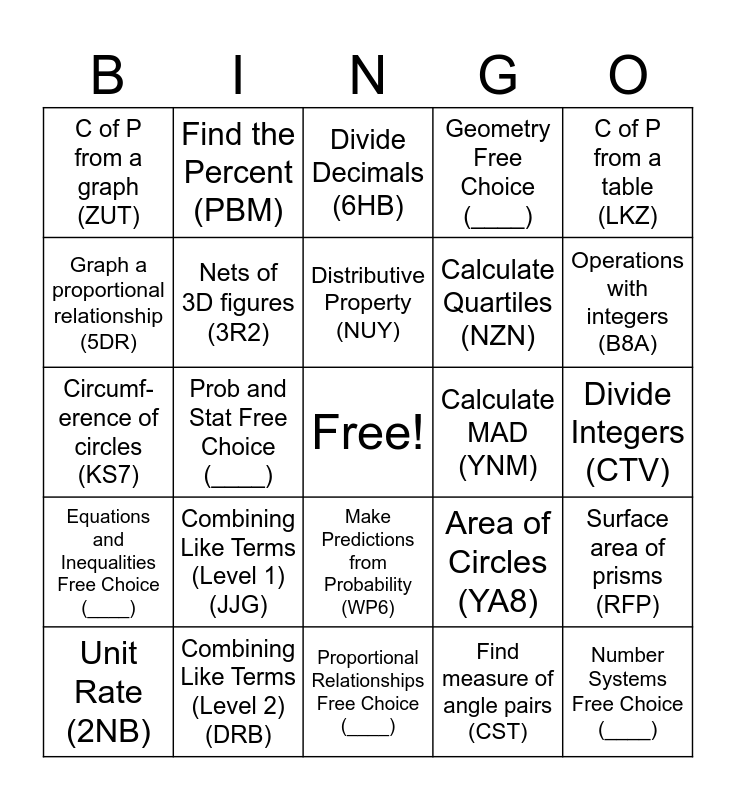 This bingo card has a free space and 24 words: Combining Like Terms (Level 1) (JJG), Combining Like Terms (Level 2) (DRB), Distributive Property (NUY), Unit Rate (2NB), C of P from a table (LKZ), C of P from a graph (ZUT), Graph a proportional relationship (5DR), Find the Percent (PBM), Calculate MAD (YNM), Make Predictions from Probability (WP6), Calculate Quartiles (NZN), Circumf-erence of circles (KS7), Area of Circles (YA8), Surface area of prisms (RFP), Nets of 3D figures (3R2), Find measure of angle pairs (CST), Divide Integers (CTV), Divide Decimals (6HB), Operations with integers (B8A), Prob and Stat Free Choice (____), Number Systems Free Choice (____), Equations and Inequalities Free Choice (____), Geometry Free Choice (____) and Proportional Relationships Free Choice (____).