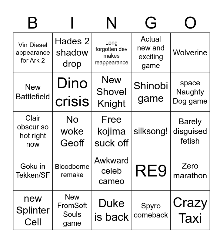 This bingo card has a free space and 24 words: Bloodborne remake, New FromSoft Souls game, New Shovel Knight, new Splinter Cell, Wolverine, Vin Diesel appearance for Ark 2, New Battlefield, Hades 2 shadow drop, silksong!, Awkward celeb cameo, Shinobi game, Clair obscur so hot right now, RE9, Zero marathon, Dino crisis, Spyro comeback, Barely disguised fetish, Long forgotten dev makes reappearance, space Naughty Dog game, No woke Geoff, Crazy Taxi, Goku in Tekken/SF, Actual new and exciting game and Duke is back.