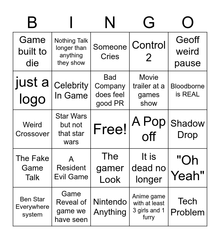 This bingo card has a free space and 24 words: A Resident Evil Game, Game Reveal of game we have seen, Bad Company does feel good PR, Ben Star Everywhere system, Geoff weird pause, Game built to die, just a logo, Nothing Talk longer than anything they show, A Pop off, The gamer Look, Movie trailer at a games show, Weird Crossover, It is dead no longer, "Oh Yeah", Celebrity In Game, Anime game with at least 3 girls and 1 furry, Shadow Drop, Someone Cries, Bloodborne is REAL, Star Wars but not that star wars, Tech Problem, The Fake Game Talk, Control 2 and Nintendo Anything.