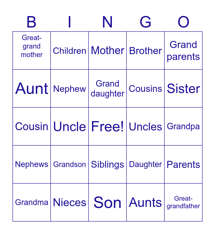 This bingo card has a free space and 24 words: Grandma, Grandson, Grand daughter, Aunts, Grand parents, Great-grand mother, Children, Mother, Uncles, Grandpa, Cousin, Nephew, Daughter, Parents, Aunt, Nieces, Son, Brother, Sister, Nephews, Uncle, Siblings, Cousins and Great-grandfather.