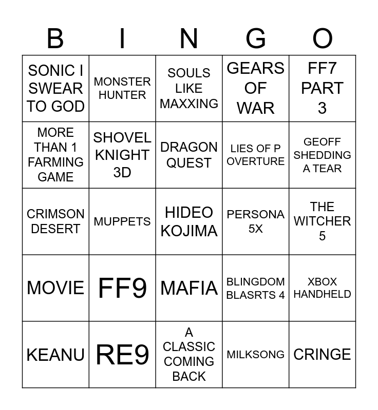 This bingo card has a free space and 24 words: FF9, RE9, DRAGON QUEST, KEANU, FF7 PART 3, SONIC I SWEAR TO GOD, MORE THAN 1 FARMING GAME, MONSTER HUNTER, PERSONA 5X, MAFIA, LIES OF P OVERTURE, CRIMSON DESERT, BLINGDOM BLASRTS 4, XBOX HANDHELD, SHOVEL KNIGHT 3D, MILKSONG, THE WITCHER 5, SOULS LIKE MAXXING, GEOFF SHEDDING A TEAR, MUPPETS, CRINGE, MOVIE, GEARS OF WAR and A CLASSIC COMING BACK.