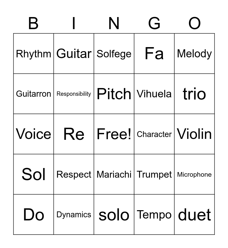 This bingo card has a free space and 26 words: Mariachi, Tempo, Pitch, Dynamics, Melody, Rhythm, Guitarron, Guitar, Violin, Trumpet, Vihuela, Voice, Microphone, Do, Re, Mi, Fa, Sol, Solfege, duet, trio, solo, Character, Respect, Responsibility and Achievement.