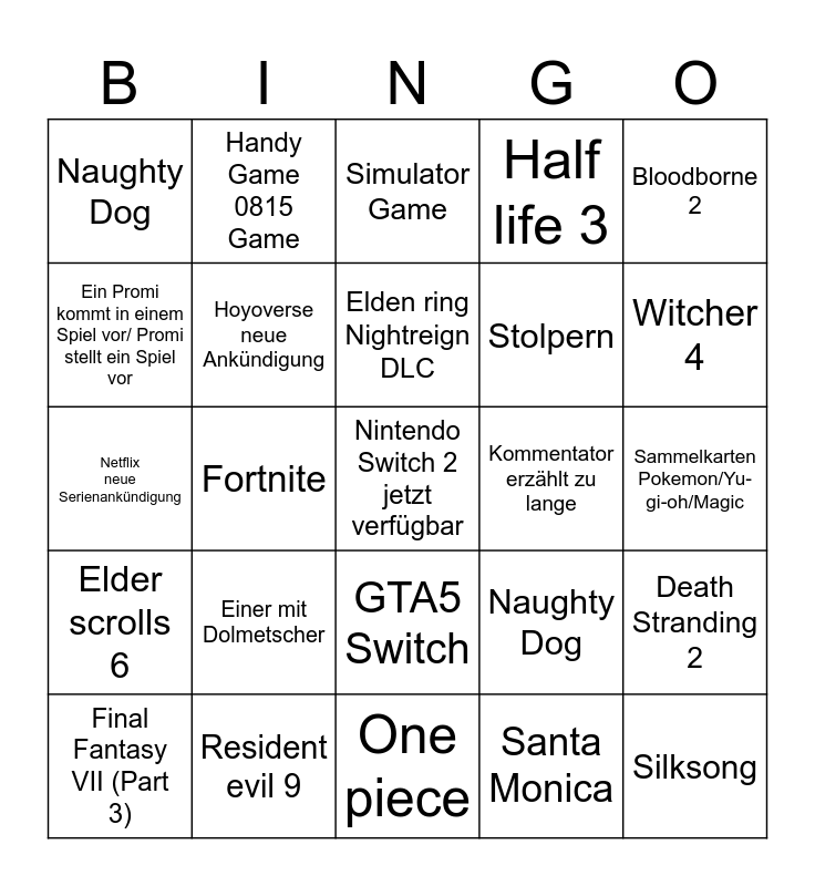 This bingo card has a free space and 24 words: Einer mit Dolmetscher, Resident evil 9, Elden ring Nightreign DLC, Final Fantasy VII (Part 3), Bloodborne 2, Naughty Dog, Ein Promi kommt in einem Spiel vor/ Promi stellt ein Spiel vor, Handy Game 0815 Game, Kommentator erzählt zu lange, GTA5 Switch, Stolpern, Netflix neue Serienankündigung, Naughty Dog, Death Stranding 2, Hoyoverse neue Ankündigung, Santa Monica, Sammelkarten Pokemon/Yu-gi-oh/Magic, Simulator Game, Witcher 4, Fortnite, Silksong, Elder scrolls 6, Half life 3 and One piece.