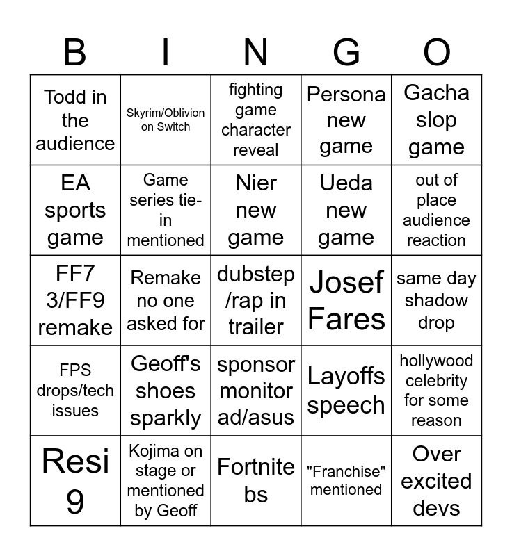 This bingo card has a free space and 24 words: Geoff's shoes sparkly, Kojima on stage or mentioned by Geoff, Nier new game, Resi 9, Gacha slop game, Todd in the audience, EA sports game, Skyrim/Oblivion on Switch, Josef Fares, sponsor monitor ad/asus, Ueda new game, FF7 3/FF9 remake, Layoffs speech, hollywood celebrity for some reason, Game series tie-in mentioned, "Franchise" mentioned, same day shadow drop, fighting game character reveal, out of place audience reaction, Remake no one asked for, Over excited devs, FPS drops/tech issues, Persona new game and Fortnite bs.