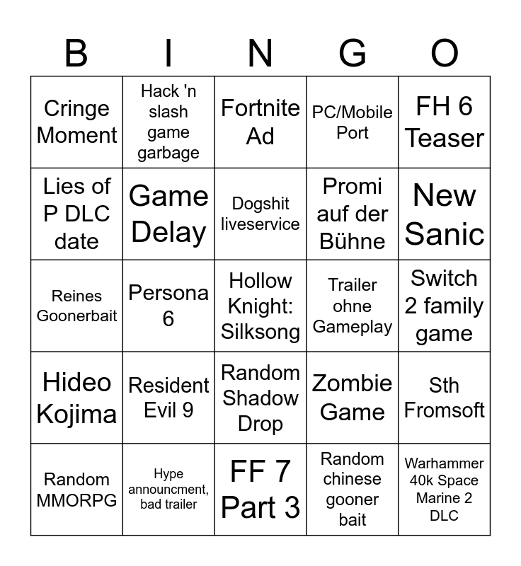 This bingo card has a free space and 24 words: Resident Evil 9, Hype announcment, bad trailer, Dogshit liveservice, Random MMORPG, FH 6 Teaser, Cringe Moment, Lies of P DLC date, Hack 'n slash game garbage, Trailer ohne Gameplay, Random Shadow Drop, Promi auf der Bühne, Reines Goonerbait, Zombie Game, Sth Fromsoft, Game Delay, Random chinese gooner bait, Switch 2 family game, Fortnite Ad, New Sanic, Persona 6, Warhammer 40k Space Marine 2 DLC, Hideo Kojima, PC/Mobile Port and FF 7 Part 3.