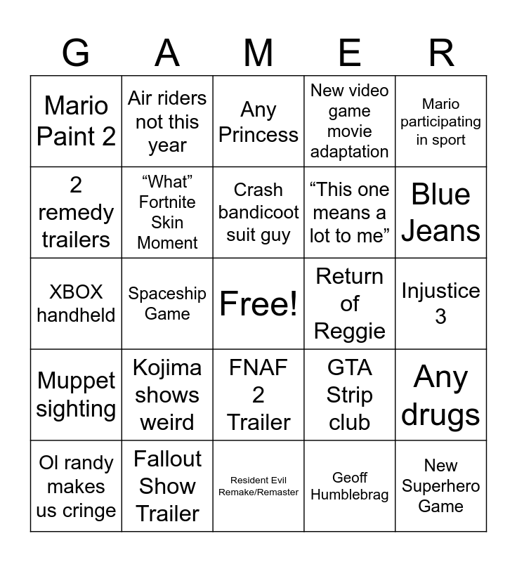 This bingo card has a free space and 30 words: Fallout Show Trailer, New Zombie Game, Spaceship Game, Update to Civ 7, Mario Paint 2, Any Princess, “What” Fortnite Skin Moment, FNAF 2 Trailer, Return of Reggie, Resident Evil Remake/Remaster, Injustice 3, New Superhero Game, Geoff Humblebrag, Terry Crews Appearence, Blue Jeans, Indie Farming Game revealed, GTA Strip club, Muppet sighting, Kojima shows weird, Mario participating in sport, XBOX handheld, New Fo76 Content, Air riders not this year, “This one means a lot to me”, 2 remedy trailers, New video game movie adaptation, Any drugs, Ol randy makes us cringe, Crash bandicoot suit guy and Geoff says leonardo or learnado.
