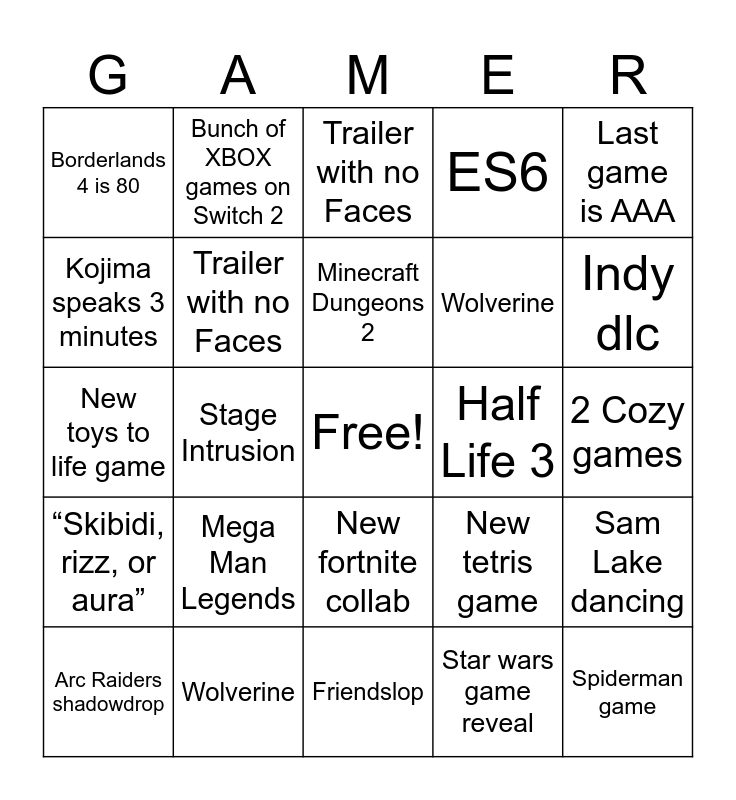 This bingo card has a free space and 31 words: Friendslop, Saying Gamer at least 10 times, Stage Intrusion, End with World Premiere, Borderlands 4 is 80, Trailer with no Faces, Trailer with no Faces, New tetris game, Half Life 3, Star wars game reveal, 2 Cozy games, Spiderman game, Birdperson, New Fortnite season, Indy dlc, Spongebob Shredding, Sam Lake dancing, Mega Man Legends, “Skibidi, rizz, or aura”, New fortnite collab, Last game is AAA, First game indie game, Arc Raiders shadowdrop, Bunch of XBOX games on Switch 2, Wolverine, Kojima speaks 3 minutes, ES6, New toys to life game, Wolverine, Minecraft Dungeons 2 and Lego game.