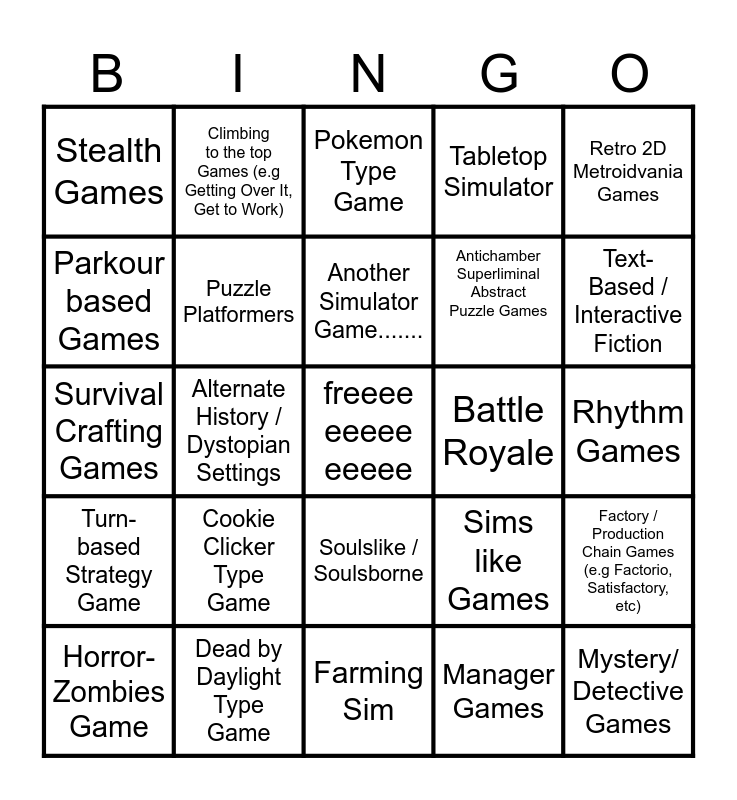 This bingo card has a free space and 29 words: Horror-Zombies Game, Remastered Games, Alternate History / Dystopian Settings, City Builders, Stealth Games, Pokemon Type Game, Puzzle Platformers, Cookie Clicker Type Game, Battle Royale, Dead by Daylight Type Game, Rhythm Games, Mystery/ Detective Games, Farming Sim, Manager Games, Text-Based / Interactive Fiction, Deckbuilders/ TCG, Soulslike / Soulsborne, Turn-based Strategy Game, Retro 2D Metroidvania Games, Survival Crafting Games, Sims like Games, FPS Shooter Games, Antichamber Superliminal Abstract Puzzle Games, Parkour based Games, Tabletop Simulator, Climbing to the top Games (e.g Getting Over It, Get to Work), Factory / Production Chain Games (e.g Factorio, Satisfactory, etc), Another Simulator Game....... and RPGMaker Type Game.