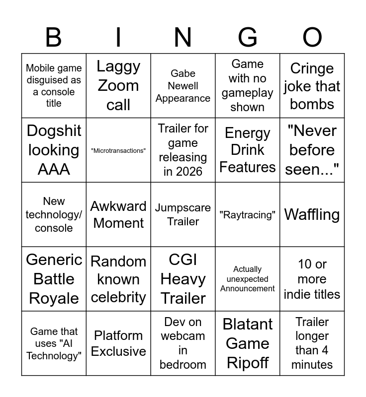This bingo card has 25 words: Random known celebrity, Dev on webcam in bedroom, Trailer for game releasing in 2026, Game that uses "AI Technology", Cringe joke that bombs, Mobile game disguised as a console title, Dogshit looking AAA, Laggy Zoom call, "Raytracing", CGI Heavy Trailer, Energy Drink Features, New technology/ console, Actually unexpected Announcement, 10 or more indie titles, "Microtransactions", Trailer longer than 4 minutes, Waffling, Gabe Newell Appearance, "Never before seen...", Awkward Moment, Jumpscare Trailer, Platform Exclusive, Generic Battle Royale, Game with no gameplay shown and Blatant Game Ripoff.