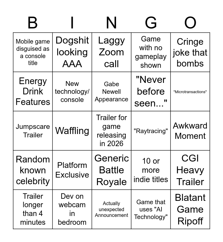 This bingo card has 25 words: Random known celebrity, Dev on webcam in bedroom, Trailer for game releasing in 2026, Game that uses "AI Technology", Cringe joke that bombs, Mobile game disguised as a console title, Dogshit looking AAA, Laggy Zoom call, "Raytracing", CGI Heavy Trailer, Energy Drink Features, New technology/ console, Actually unexpected Announcement, 10 or more indie titles, "Microtransactions", Trailer longer than 4 minutes, Waffling, Gabe Newell Appearance, "Never before seen...", Awkward Moment, Jumpscare Trailer, Platform Exclusive, Generic Battle Royale, Game with no gameplay shown and Blatant Game Ripoff.
