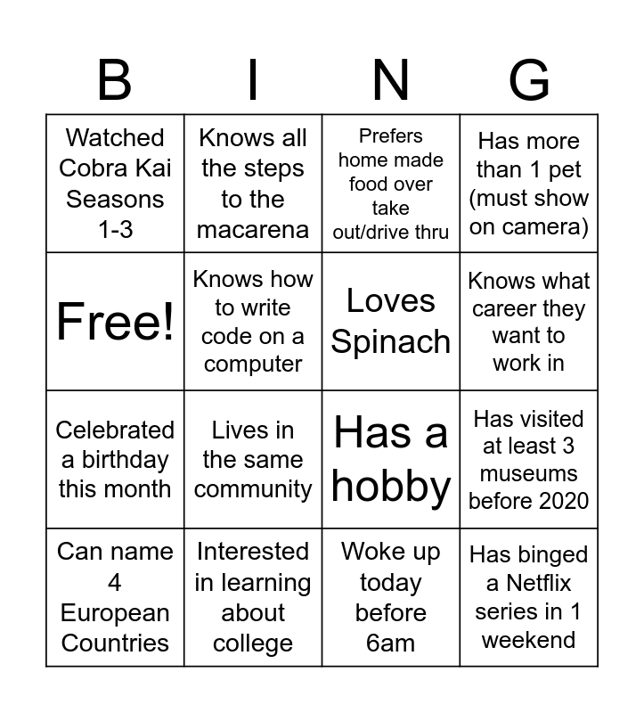 This bingo card has 21 words: Celebrated a birthday this month, Interested in learning about college, Loves Spinach, Has binged a Netflix series in 1 weekend, Can name 4 European Countries, Knows all the steps to the macarena, Prefers home made food over take out/drive thru, Has more than 1 pet (must show on camera), Free!, Knows how to write code on a computer, Woke up today before 6am, Knows what career they want to work in, Can speak more than 1 language, Lives in the same community, Has a hobby, Has read a book because you watched the show or movie, Has more than 2 siblings, Has visited at least 3 museums before 2020, Watched Cobra Kai Seasons 1-3, Has a hobby and Attends school or work from home.
