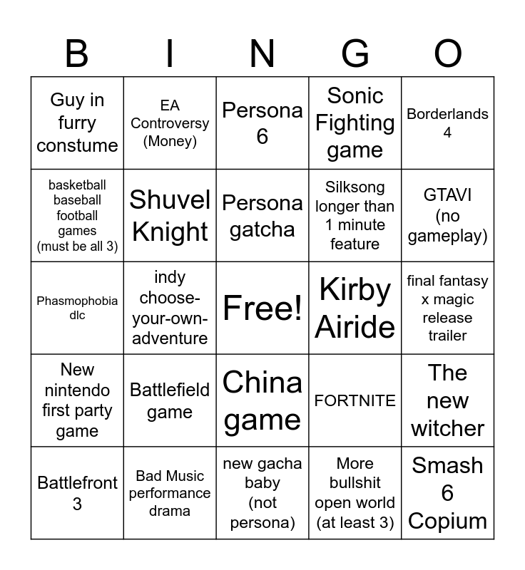 This bingo card has a free space and 24 words: Battlefield game, Bad Music performance drama, Persona gatcha, Battlefront 3, Borderlands 4, Guy in furry constume, basketball baseball football games (must be all 3), EA Controversy (Money), Kirby Airide, China game, Silksong longer than 1 minute feature, Phasmophobia dlc, FORTNITE, The new witcher, Shuvel Knight, More bullshit open world (at least 3), final fantasy x magic release trailer, Persona 6, GTAVI (no gameplay), indy choose-your-own-adventure, Smash 6 Copium, New nintendo first party game, Sonic Fighting game and new gacha baby (not persona).