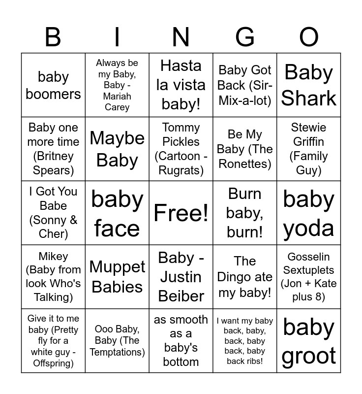 This bingo card has a free space and 31 words: as smooth as a baby's bottom, as easy as taking candy from a baby, baby face, baby daddy, baby boomers, Hasta la vista baby!, Maybe Baby, The Dingo ate my baby!, Burn baby, burn!, I want my baby back, baby, back, baby back, baby back ribs!, baby yoda, baby groot, Frances (Baby)-Dirty Dancing, Boss Baby, Stewie Griffin (Family Guy), Jesus, Gosselin Sextuplets (Jon + Kate plus 8), Muppet Babies, Mikey (Baby from look Who's Talking), Baby -Justin Beiber, Baby Shark, Ice Ice baby, Give it to me baby (Pretty fly for a white guy - Offspring), Always be my Baby, Baby - Mariah Carey, Be My Baby (The Ronettes), Baby one more time (Britney Spears), Baby Got Back (Sir-Mix-a-lot), I Got You Babe (Sonny & Cher), Ooo Baby, Baby (The Temptations), Tommy Pickles (Cartoon - Rugrats) and Maggie Simpson (The Simpson's).