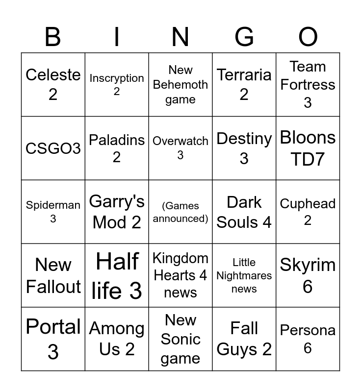 This bingo card has a free space and 24 words: Half life 3, Among Us 2, Overwatch 3, Portal 3, Team Fortress 3, Celeste 2, CSGO3, Inscryption 2, Dark Souls 4, Kingdom Hearts 4 news, Destiny 3, Spiderman 3, Little Nightmares news, Skyrim 6, Paladins 2, Fall Guys 2, Cuphead 2, New Behemoth game, Bloons TD7, Garry's Mod 2, Persona 6, New Fallout, Terraria 2 and New Sonic game.