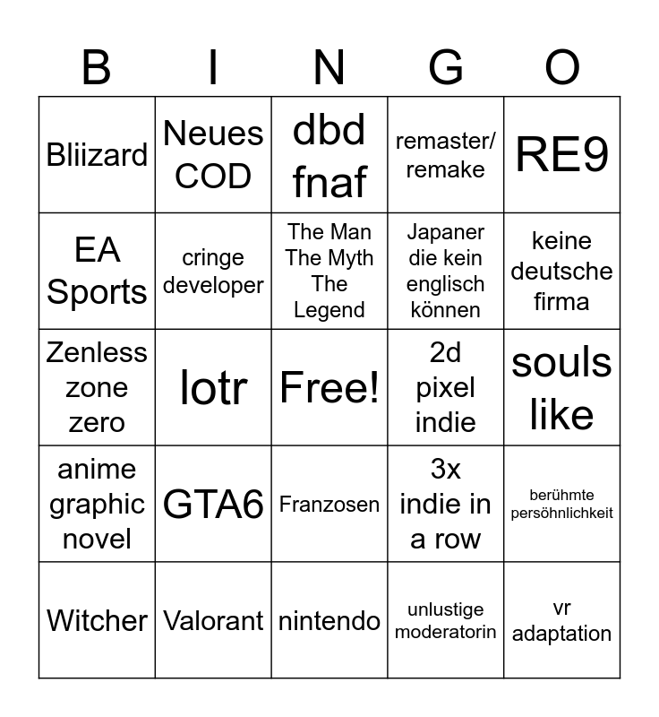 This bingo card has a free space and 24 words: GTA6, Valorant, The Man The Myth The Legend, Witcher, RE9, Bliizard, EA Sports, Neues COD, 2d pixel indie, Franzosen, Japaner die kein englisch können, Zenless zone zero, 3x indie in a row, berühmte persöhnlichkeit, cringe developer, unlustige moderatorin, souls like, dbd fnaf, keine deutsche firma, lotr, vr adaptation, anime graphic novel, remaster/ remake and nintendo.