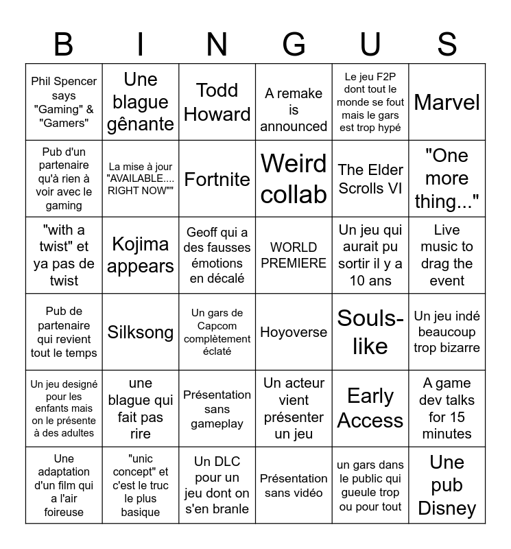 This bingo card has 36 words: Un acteur vient présenter un jeu, Présentation sans gameplay, Présentation sans vidéo, Pub d'un partenaire qu'à rien à voir avec le gaming, Pub de partenaire qui revient tout le temps, WORLD PREMIERE, La mise à jour "AVAILABLE.... RIGHT NOW"", Un DLC pour un jeu dont on s'en branle, Le jeu F2P dont tout le monde se fout mais le gars est trop hypé, Early Access, "One more thing...", A remake is announced, A game dev talks for 15 minutes, Kojima appears, Weird collab, Phil Spencer says "Gaming" & "Gamers", Un jeu designé pour les enfants mais on le présente à des adultes, Un jeu qui aurait pu sortir il y a 10 ans, "with a twist" et ya pas de twist, Todd Howard, Geoff qui a des fausses émotions en décalé, Silksong, Hoyoverse, Un gars de Capcom complètement éclaté, Souls-like, Une blague gênante, The Elder Scrolls VI, "unic concept" et c'est le truc le plus basique, Fortnite, Marvel, Une pub Disney, Une adaptation d'un film qui a l'air foireuse, Un jeu indé beaucoup trop bizarre, Live music to drag the event, une blague qui fait pas rire and un gars dans le public qui gueule trop ou pour tout.
