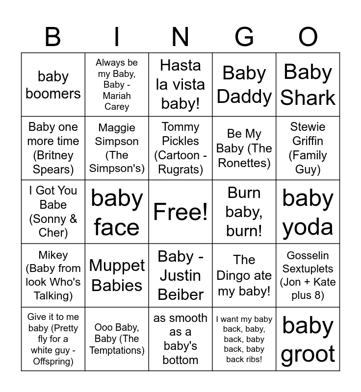 This bingo card has a free space and 31 words: as smooth as a baby's bottom, as easy as taking candy from a baby, baby face, Baby Got Back (Sir-Mix-a-lot), baby boomers, Hasta la vista baby!, Maggie Simpson (The Simpson's), The Dingo ate my baby!, Burn baby, burn!, I want my baby back, baby, back, baby back, baby back ribs!, baby yoda, baby groot, Frances (Baby)-Dirty Dancing, Boss Baby, Stewie Griffin (Family Guy), Jesus, Gosselin Sextuplets (Jon + Kate plus 8), Muppet Babies, Mikey (Baby from look Who's Talking), Baby -Justin Beiber, Baby Shark, Ice Ice baby, Give it to me baby (Pretty fly for a white guy - Offspring), Always be my Baby, Baby - Mariah Carey, Be My Baby (The Ronettes), Baby one more time (Britney Spears), Baby Daddy, I Got You Babe (Sonny & Cher), Ooo Baby, Baby (The Temptations), Tommy Pickles (Cartoon - Rugrats) and Maybe Baby.
