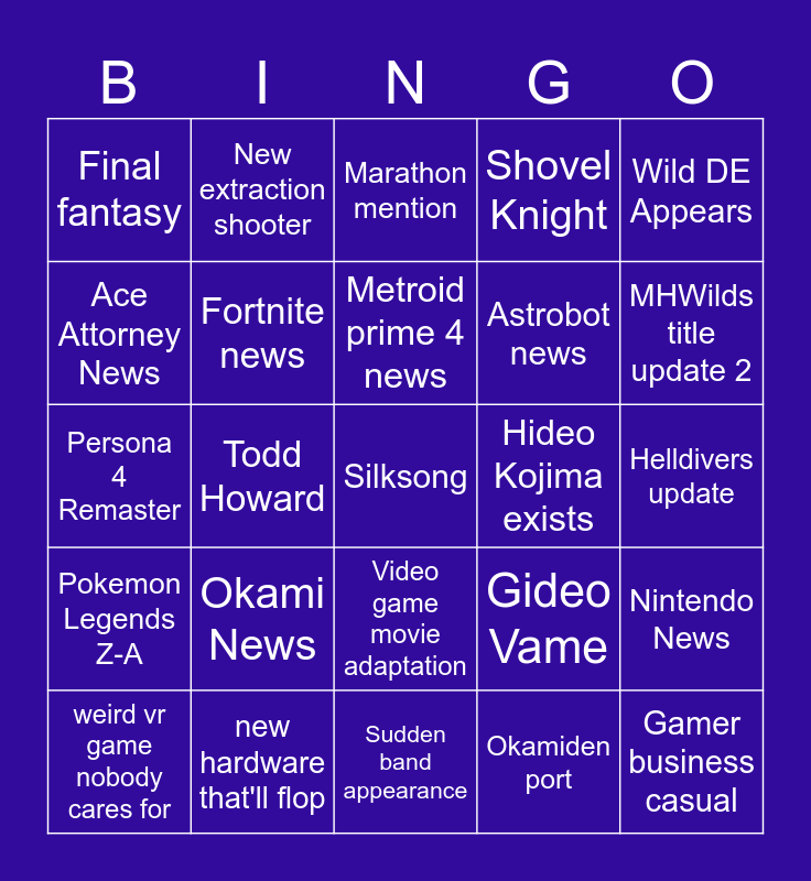 This bingo card has 25 words: Okami News, Sudden band appearance, Metroid prime 4 news, weird vr game nobody cares for, Wild DE Appears, Final fantasy, Ace Attorney News, New extraction shooter, Hideo Kojima exists, Video game movie adaptation, Astrobot news, Persona 4 Remaster, Gideo Vame, Nintendo News, Fortnite news, Gamer business casual, Helldivers update, Marathon mention, MHWilds title update 2, Todd Howard, Silksong, new hardware that'll flop, Pokemon Legends Z-A, Shovel Knight and Okamiden port.