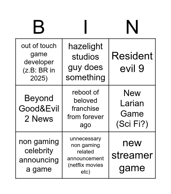 This bingo card has a free space and 8 words: New Larian Game (Sci Fi?), Resident evil 9, hazelight studios guy does something, non gaming celebrity announcing a game, out of touch game developer (z.B: BR in 2025), new streamer game, Beyond Good&Evil 2 News and unnecessary non gaming related announcement (netflix movies etc).