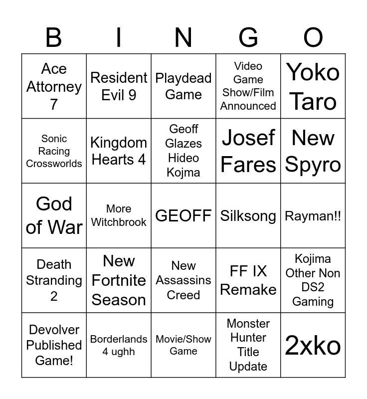 This bingo card has a free space and 24 words: New Fortnite Season, Borderlands 4 ughh, Geoff Glazes Hideo Kojma, Devolver Published Game!, Yoko Taro, Ace Attorney 7, Sonic Racing Crossworlds, Resident Evil 9, Silksong, New Assassins Creed, Josef Fares, God of War, FF IX Remake, Kojima Other Non DS2 Gaming, Kingdom Hearts 4, Monster Hunter Title Update, Rayman!!, Playdead Game, New Spyro, More Witchbrook, 2xko, Death Stranding 2, Video Game Show/Film Announced and Movie/Show Game.