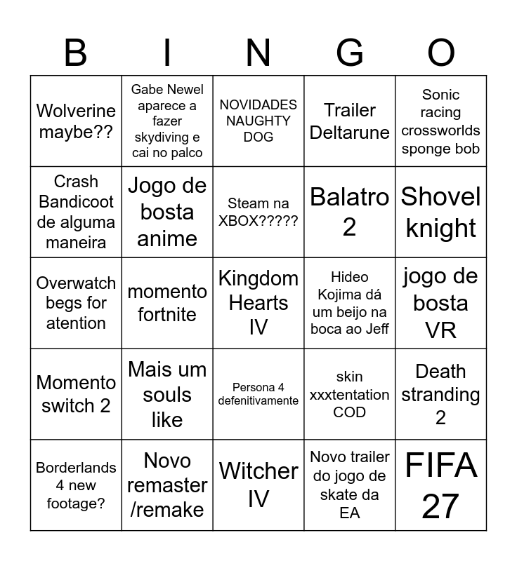 This bingo card has a free space and 24 words: Mais um souls like, Novo remaster /remake, Steam na XBOX?????, Borderlands 4 new footage?, Sonic racing crossworlds sponge bob, Wolverine maybe??, Crash Bandicoot de alguma maneira, Gabe Newel aparece a fazer skydiving e cai no palco, Hideo Kojima dá um beijo na boca ao Jeff, Persona 4 defenitivamente, Balatro 2, Overwatch begs for atention, skin xxxtentation COD, Death stranding 2, Jogo de bosta anime, Novo trailer do jogo de skate da EA, jogo de bosta VR, NOVIDADES NAUGHTY DOG, Shovel knight, momento fortnite, FIFA 27, Momento switch 2, Trailer Deltarune and Witcher IV.