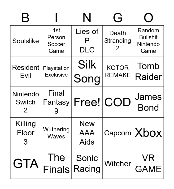 This bingo card has a free space and 24 words: GTA, Wuthering Waves, Silk Song, Witcher, Random Bullshit Nintendo Game, Soulslike, 1st Person Soccer Game, Lies of P DLC, COD, James Bond, Nintendo Switch 2, Playstation Exclusive, Capcom, Xbox, Resident Evil, The Finals, Sonic Racing, Death Stranding 2, Tomb Raider, Killing Floor 3, Final Fantasy 9, New AAA Aids, KOTOR REMAKE and VR GAME.