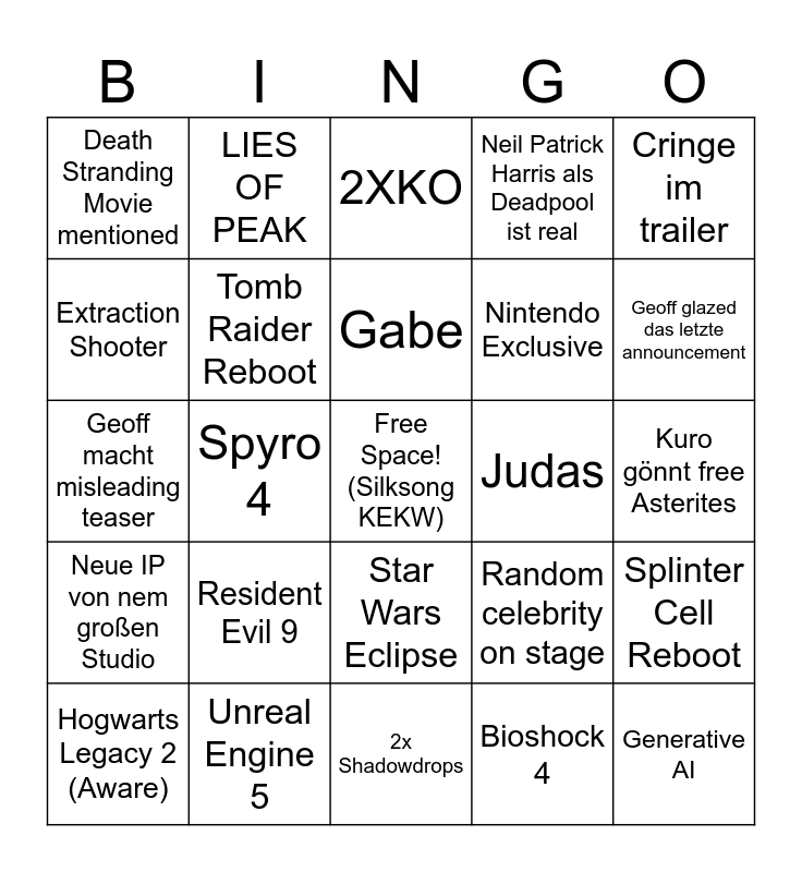This bingo card has a free space and 24 words: Resident Evil 9, Unreal Engine 5, Gabe, Hogwarts Legacy 2 (Aware), Cringe im trailer, Death Stranding Movie mentioned, Extraction Shooter, LIES OF PEAK, Judas, Star Wars Eclipse, Nintendo Exclusive, Geoff macht misleading teaser, Random celebrity on stage, Splinter Cell Reboot, Tomb Raider Reboot, Bioshock 4, Kuro gönnt free Asterites, 2XKO, Geoff glazed das letzte announcement, Spyro 4, Generative AI, Neue IP von nem großen Studio, Neil Patrick Harris als Deadpool ist real and 2x Shadowdrops.