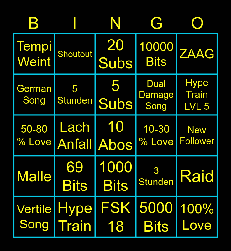 This bingo card has a free space and 24 words: 69 Bits, Hype Train, 5 Subs, Vertile Song, ZAAG, Tempi Weint, German Song, Shoutout, 10-30 % Love, 1000 Bits, Dual Damage Song, 50-80 % Love, 3 Stunden, Raid, 5 Stunden, 5000 Bits, New Follower, 20 Subs, Hype Train LVL 5, Lach Anfall, 100% Love, Malle, 10000 Bits and FSK 18.