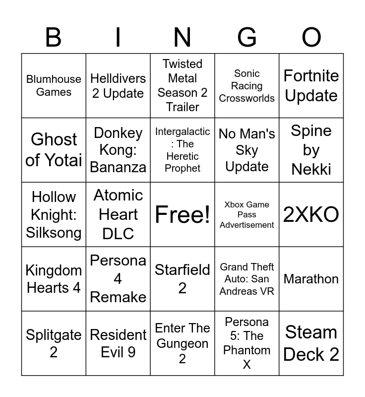 This bingo card has a free space and 24 words: Persona 4 Remake, Resident Evil 9, Intergalactic : The Heretic Prophet, Splitgate 2, Fortnite Update, Blumhouse Games, Ghost of Yotai, Helldivers 2 Update, Xbox Game Pass Advertisement, Starfield 2, No Man's Sky Update, Hollow Knight: Silksong, Grand Theft Auto: San Andreas VR, Marathon, Donkey Kong: Bananza, Persona 5: The Phantom X, 2XKO, Twisted Metal Season 2 Trailer, Spine by Nekki, Atomic Heart DLC, Steam Deck 2, Kingdom Hearts 4, Sonic Racing Crossworlds and Enter The Gungeon 2.