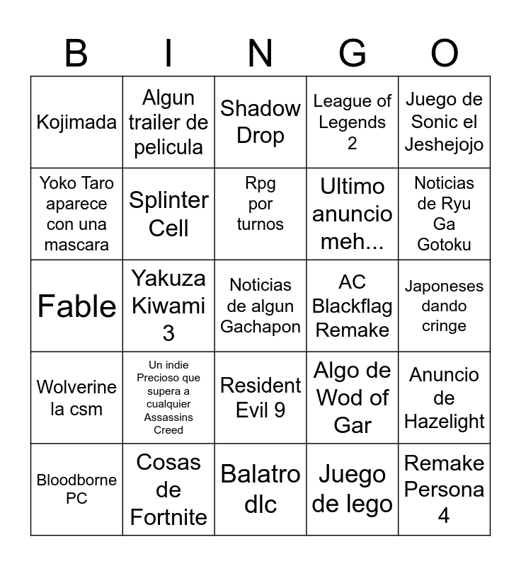 This bingo card has a free space and 24 words: Un indie Precioso que supera a cualquier Assassins Creed, Cosas de Fortnite, Rpg por turnos, Bloodborne PC, Juego de Sonic el Jeshejojo, Kojimada, Yoko Taro aparece con una mascara, Algun trailer de pelicula, AC Blackflag Remake, Resident Evil 9, Ultimo anuncio meh..., Fable, Algo de Wod of Gar, Anuncio de Hazelight, Splinter Cell, Juego de lego, Japoneses dando cringe, Shadow Drop, Noticias de Ryu Ga Gotoku, Yakuza Kiwami 3, Remake Persona 4, Wolverine la csm, League of Legends 2 and Balatro dlc.