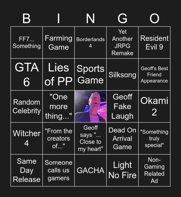 This bingo card has a free space and 24 words: "From the creators of...", Someone calls us gamers, Sports Game, Same Day Release, Resident Evil 9, FF7... Something, GTA 6, Farming Game, Geoff Fake Laugh, Geoff says "... Close to my heart", Silksong, Random Celebrity, Dead On Arrival Game, "Something truly special", Lies of PP, Light No Fire, Okami 2, Borderlands 4, Geoff's Best Friend Appearance, "One more thing...", Non-Gaming Related Ad, Witcher 4, Yet Another JRPG Remake and GACHA.