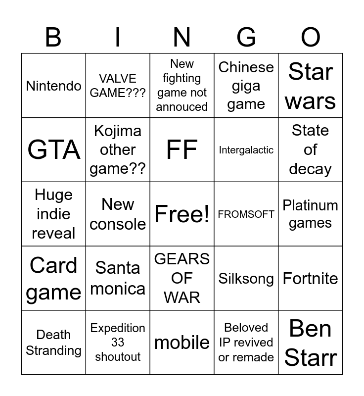 This bingo card has a free space and 24 words: Santa monica, Expedition 33 shoutout, FF, Death Stranding, Star wars, Nintendo, GTA, VALVE GAME???, FROMSOFT, GEARS OF WAR, Intergalactic, Huge indie reveal, Silksong, Fortnite, Kojima other game??, Beloved IP revived or remade, Platinum games, New fighting game not annouced, State of decay, New console, Ben Starr, Card game, Chinese giga game and mobile.