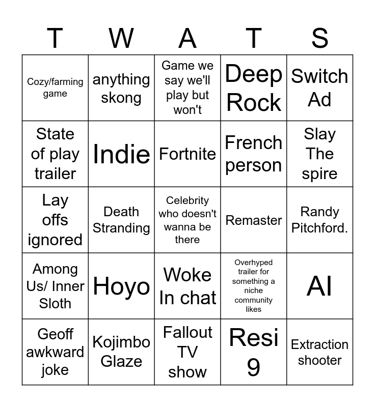 This bingo card has a free space and 24 words: Hoyo, Kojimbo Glaze, Fortnite, Geoff awkward joke, Switch Ad, Cozy/farming game, State of play trailer, anything skong, Remaster, Woke In chat, French person, Lay offs ignored, Overhyped trailer for something a niche community likes, AI, Indie, Resi 9, Randy Pitchford., Game we say we'll play but won't, Slay The spire, Death Stranding, Extraction shooter, Among Us/ Inner Sloth, Deep Rock and Fallout TV show.