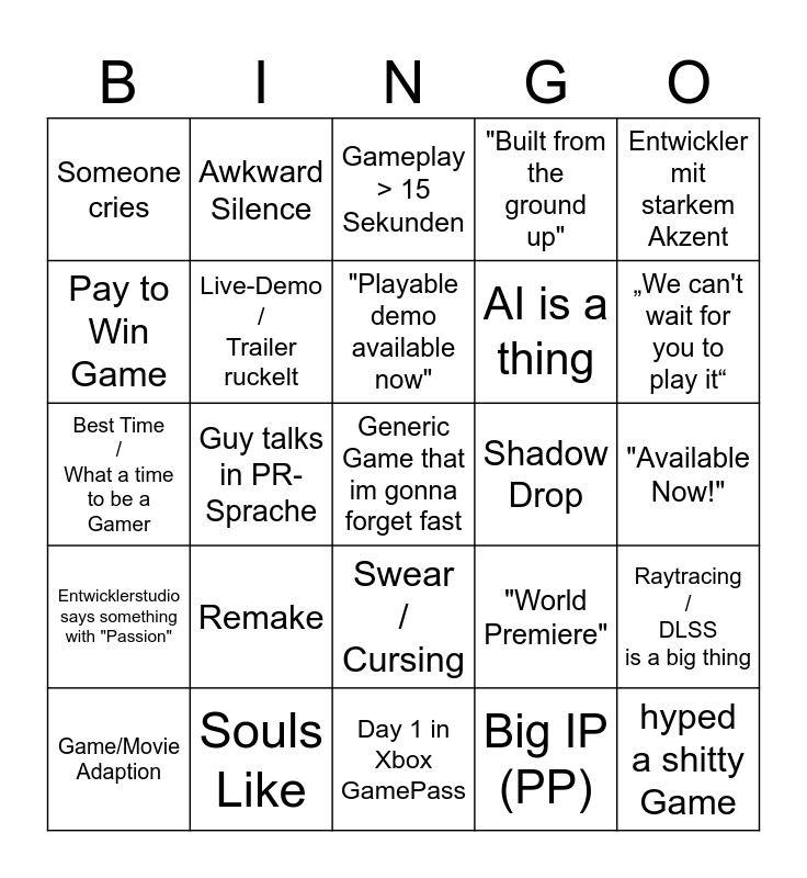 This bingo card has a free space and 24 words: Remake, Souls Like, "Playable demo available now", Game/Movie Adaption, Entwickler mit starkem Akzent, Someone cries, Pay to Win Game, Awkward Silence, Shadow Drop, Swear / Cursing, AI is a thing, Best Time / What a time to be a Gamer, "World Premiere", Raytracing / DLSS is a big thing, Live-Demo / Trailer ruckelt, Big IP (PP), "Available Now!", Gameplay > 15 Sekunden, „We can't wait for you to play it“, Guy talks in PR-Sprache, hyped a shitty Game, Entwicklerstudio says something with "Passion", "Built from the ground up" and Day 1 in Xbox GamePass.
